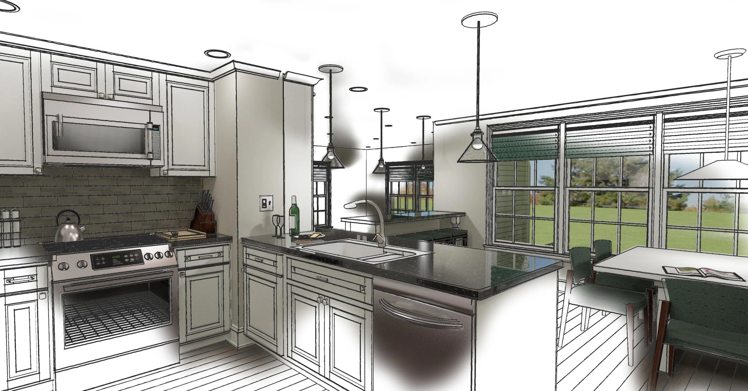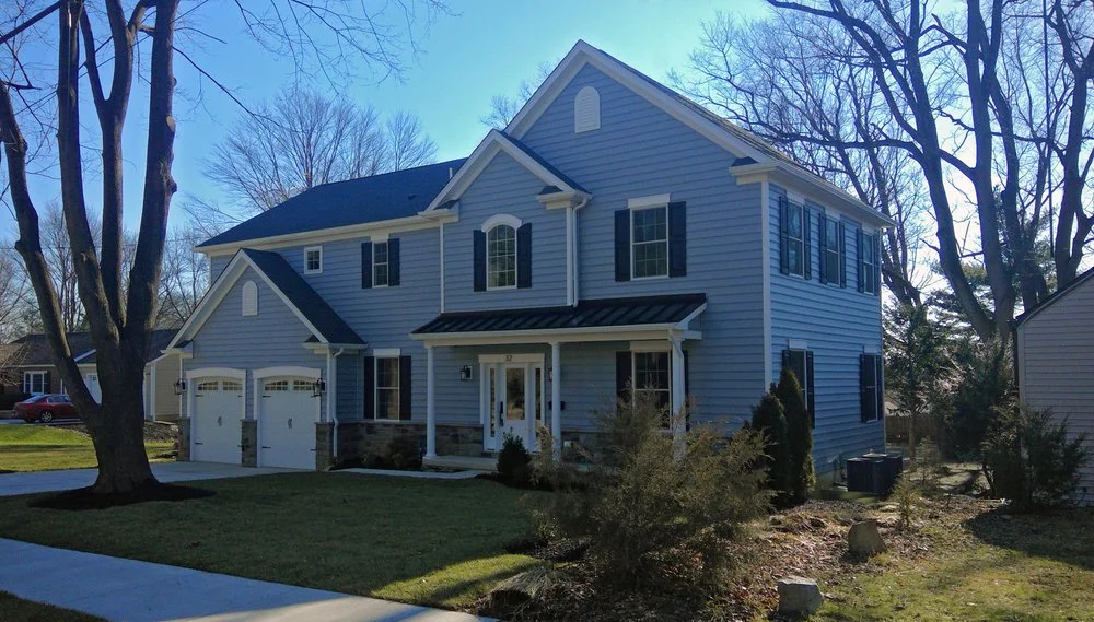 Our firm worked with a local contractor to renovate a dilapidated Haddonfield house into an elegant single family home. A series of windows and french doors make up the rear left facade, allowing afternoon sun to highlight the dining and kitchen areas.